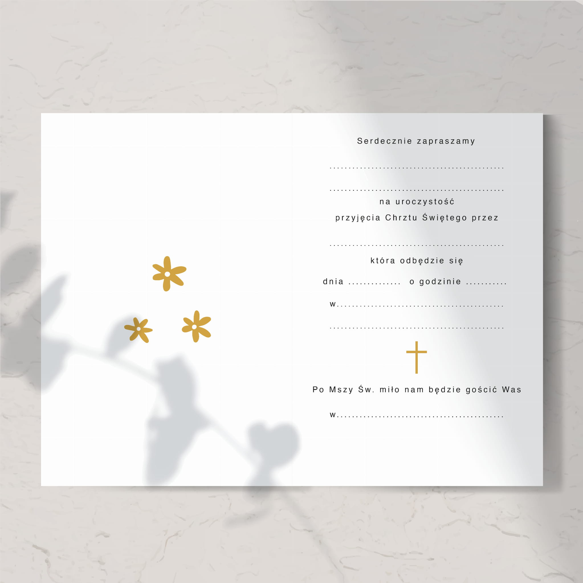 Minimalistyczne i delikatne zaproszenie na Chrzest do własnoręcznego uzupełnienia. Drukowane na papierze o gramaturze 300 g. Zaproszenie do własnoręcznego uzupełnienia. W zestawie ekologiczna koperta C6.